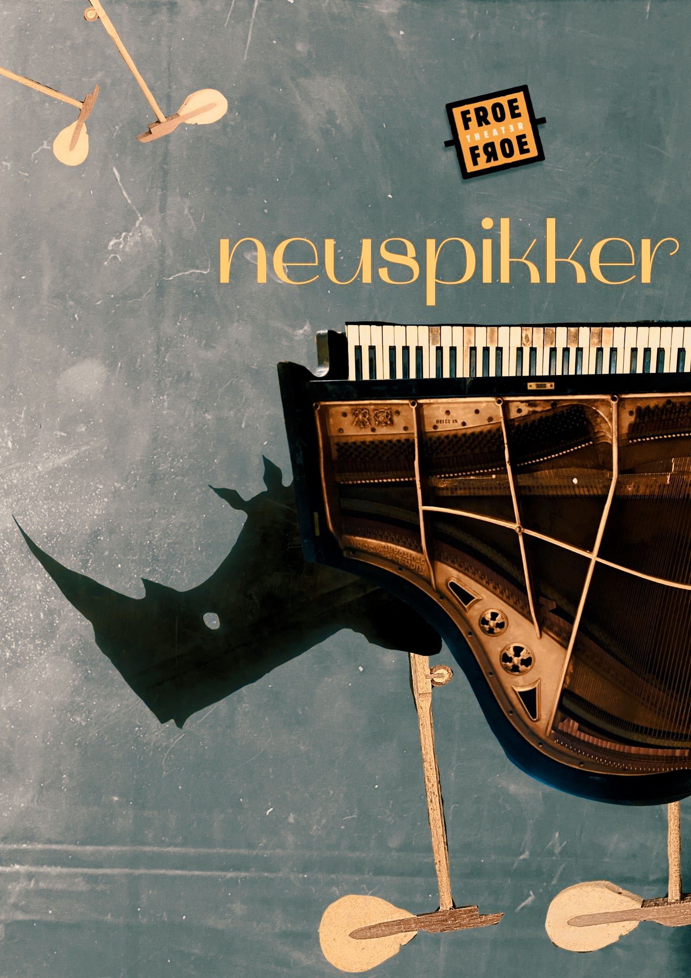 Wat was er eerst: de neushoorn of het ei? 'Kip' in het Frans is “poulet” maar “Poulenc” is een componist. Poulenc had een grote neus. Niet zo groot als de neus van de neushoorn maar wel groot genoeg om noten uit te pikken. Veel noten. Hele noten, halve noten, hazelnoten, vogelpoten die uit de maat lopen. Zo zijn ze, die vogels. Tenzij ze op een ei zitten. Een neushoorn kan ook met een ei zitten. En zo is de cirkel rond, eirond om precies te zijn. Juist gelijk ons podium. Kom keiken, kuiken, kijken.